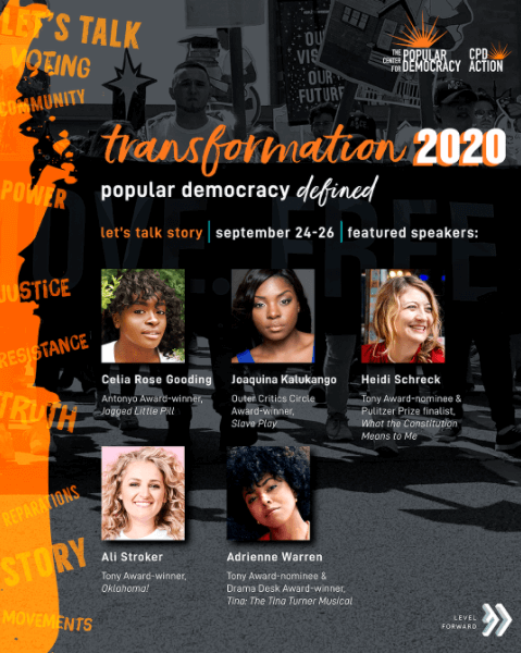 In September of 2020, Level Forward produced Transformation 2020: Popular Democracy Defined, an interactive virtual event that included more than 40 different sessions over three days of programming, and offered participants innovative ways to defend and advance democracy. Hosted by the Center for Popular Democracy, the event gathered some of the world’s most influential artists, community organizers, and social change leaders for an historic series of events.